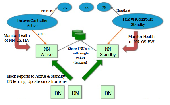 HDFS 고가용성은 이중화된 두 대의 서버인 Active 네임노드와 Standby 네임 노드를 이용하여 지원한다. 액티브 네임 노드와 스탠바이 네임 노드는 데이터 노드로부터 블록 리포트와 하트비트를 모두 받아서 동일한 메타데이터를 유지하고, 공유 스토리지를 이용하여 에디트파일을 공유한다.